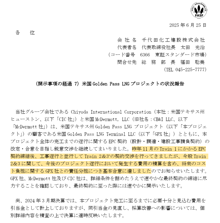 プロジェクトを共同遂行していたZachry社が経営破綻したことによるコスト負担などの最終調整を行っている。これによる不透明感がここ1年くらい重しになっていた模様。