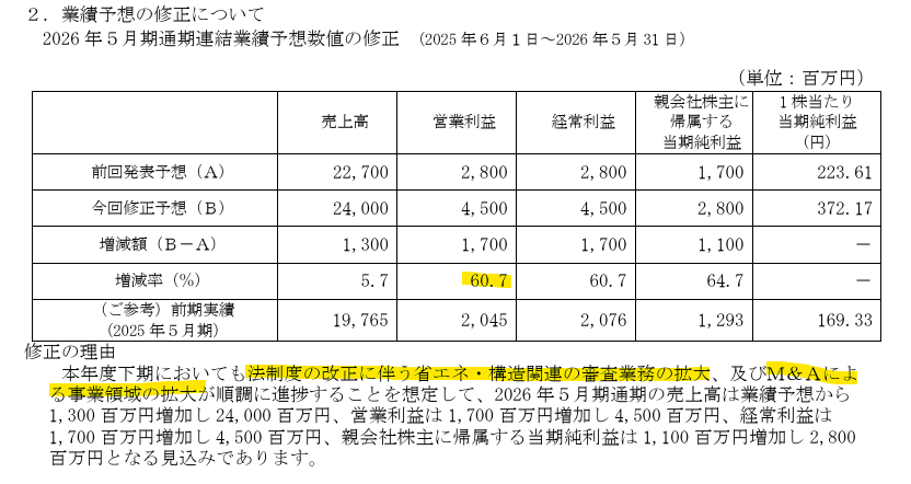 - 収益モデル: 新設着工に連動する建築確認等の審査手数料収入(フロー)と、M&Aにより拡大中の定期検査・インフラ点検等の継続的収入(ストック)のハイブリッド型。