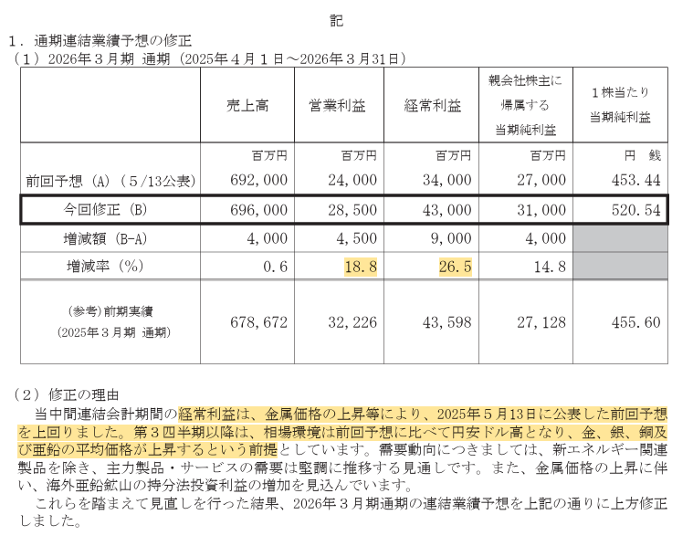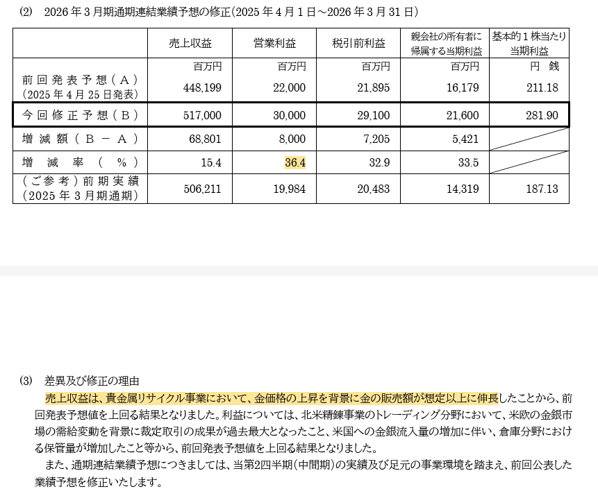 • 収益モデル: 製錬事業における鉱石・廃材の加工対価である「加工賃(TC/RC)」および販売プレミアムの獲得と、電子・機能材料の製品販売収益。