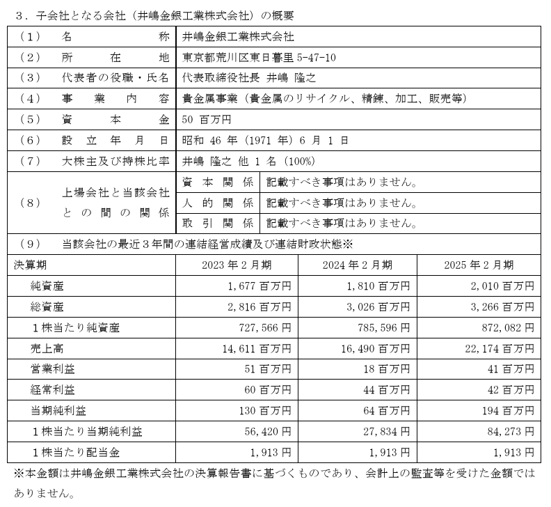 井嶋金銀工業株式会社を子会社化。貴金属のリサイクルってシナジーあるのだろうか。