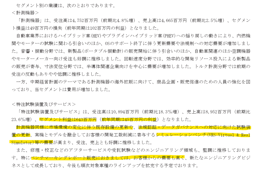 - 収益モデル: 汎用計測機器(センサー・解析機)や特注試験装置等のハードウェア販売に加え、受託試験・コンサルティング・ベンチマーキングデータ提供などの技術サービス対価。