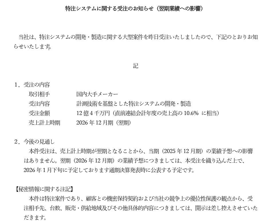 12月に受注に関する開示も