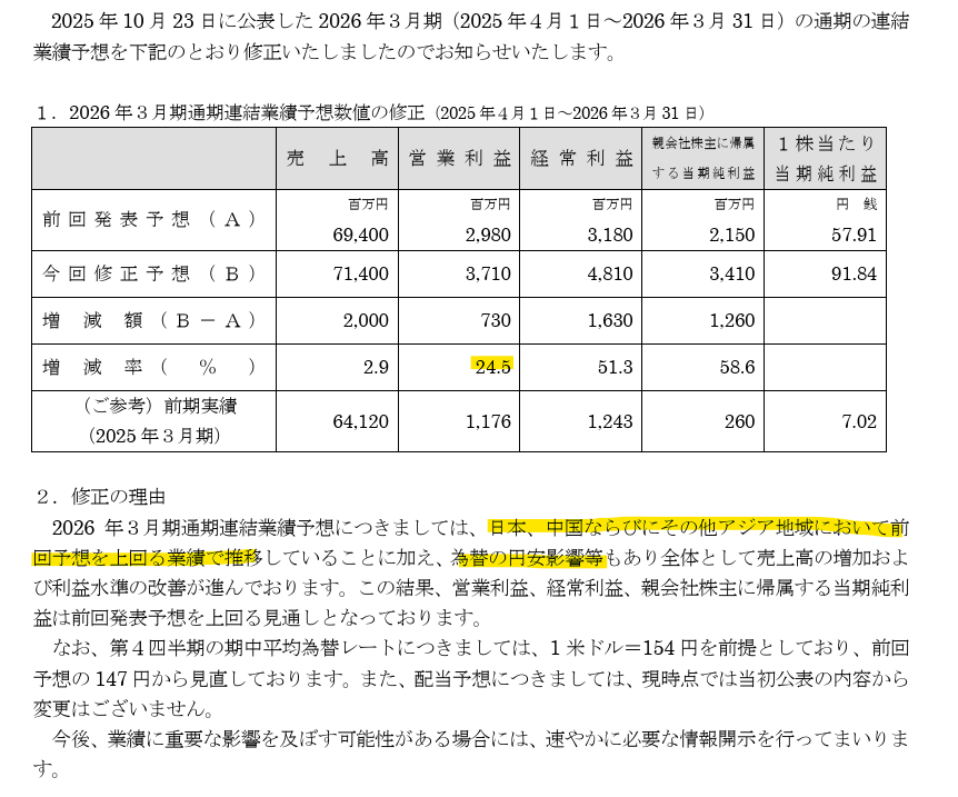 通期上方修正。11月に開示見たのに忘れてしまってた。