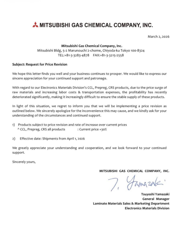 2026年4月1日出荷分から、CCL、プリプレグ、CRSの全製品を30%値上げ